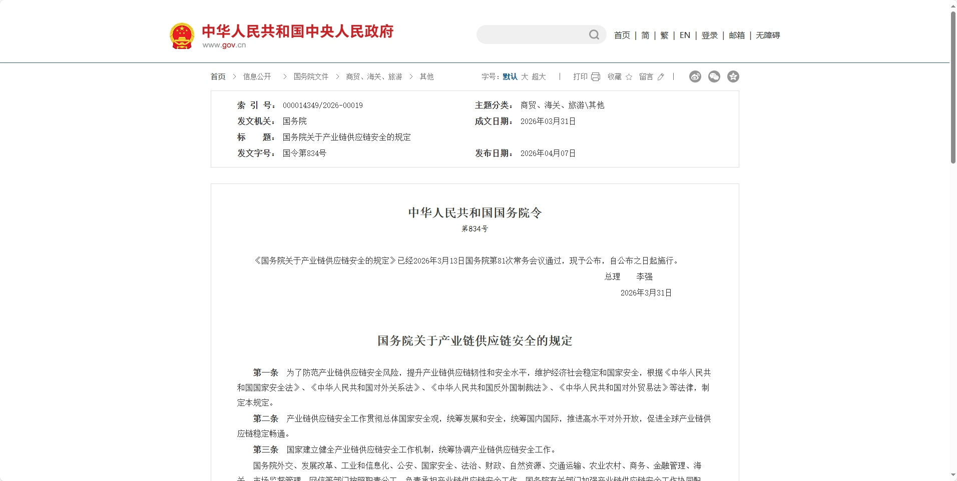 行业资讯 | 2026/04/08 国务院关于产业链供应链安全的规定 国务院关于产业链供应链安全的规定 第一条 为了防范产业链供应链安全风险,提升产业链供应链韧性和安全水平,维护经济社会稳定和国家安全,根据《中华人民...